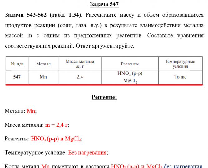 Задачи 543-562 (табл. 1.34). Рассчитайте массу и объем образовавшихся продуктов реакции (соли, газа, н.у.) в результате взаимодействия металла массой m с одним из предложенных реагентов. Составьте уравнения соответствующих реакций. Ответ аргументируйте.