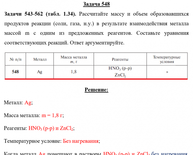 Задачи 543-562 (табл. 1.34). Рассчитайте массу и объем образовавшихся продуктов реакции (соли, газа, н.у.) в результате взаимодействия металла массой m с одним из предложенных реагентов. Составьте уравнения соответствующих реакций. Ответ аргументируйте..
