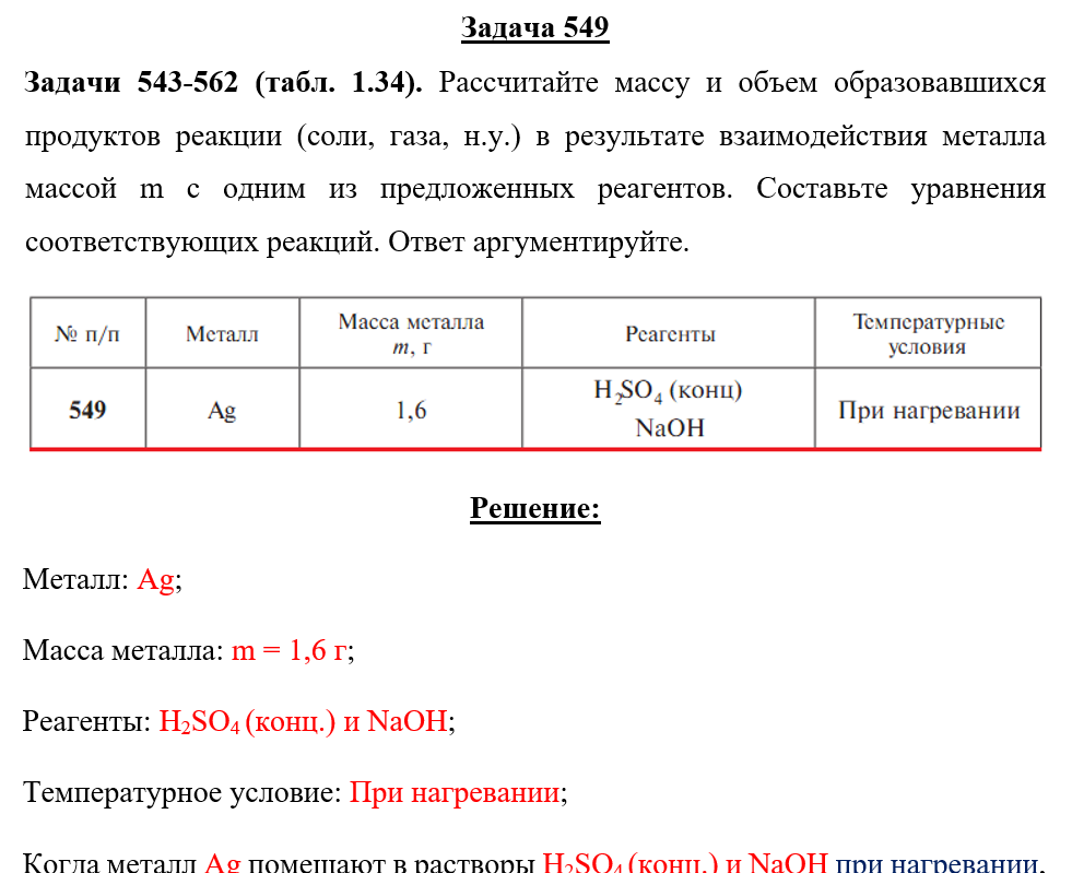 Задачи 543-562 (табл. 1.34). Рассчитайте массу и объем образовавшихся продуктов реакции (соли, газа, н.у.) в результате взаимодействия металла массой m с одним из предложенных реагентов. Составьте уравнения соответствующих реакций. Ответ аргументируйте.