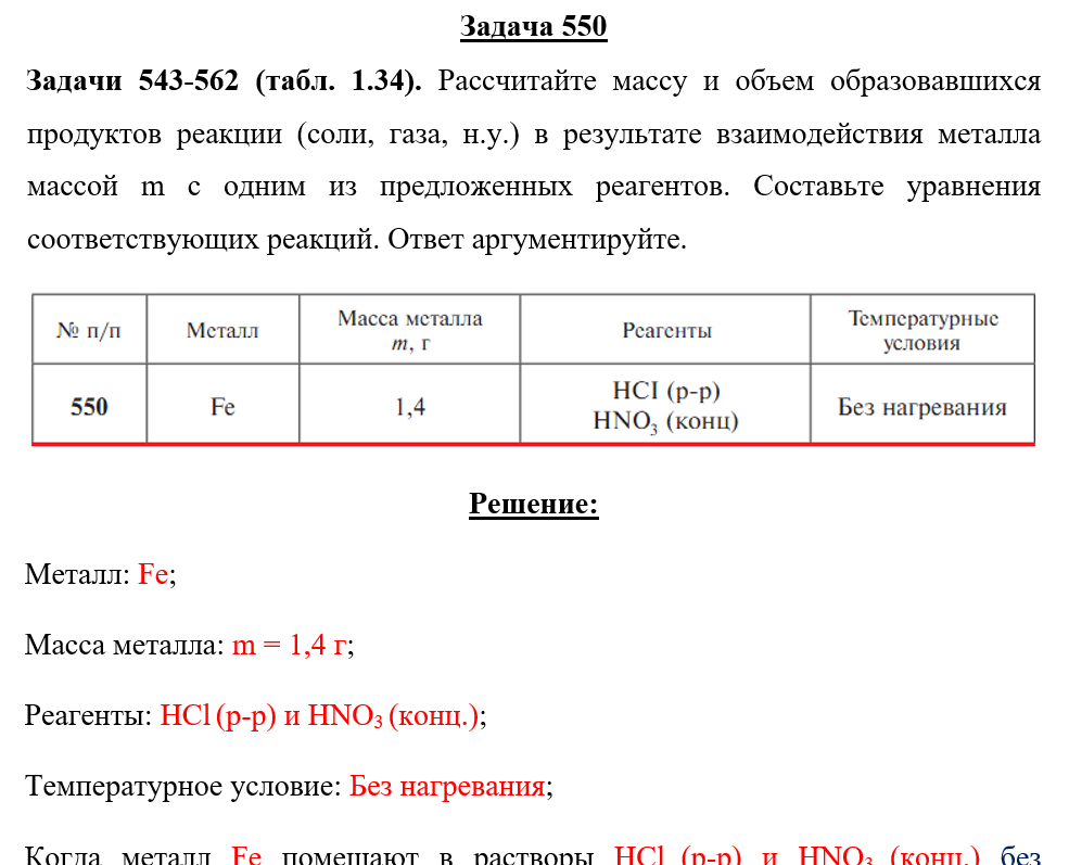Задачи 543-562 (табл. 1.34). Рассчитайте массу и объем образовавшихся продуктов реакции (соли, газа, н.у.) в результате взаимодействия металла массой m с одним из предложенных реагентов. Составьте уравнения соответствующих реакций. Ответ аргументируйте..