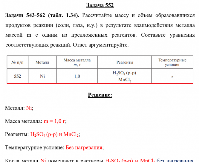 Для студентов по предмету ХимияЗадача 552 - Рассчитайте массу и объем образовавшихся продуктов реакции (соли, газа, н.у.) в результате взаимодействия металла массой m с одним из преЗадача 552 - Рассчитайте массу и объем образовавшихся продуктов реакции (соли, газа, н.у.) в результате взаимодействия металла массой m с одним из пре