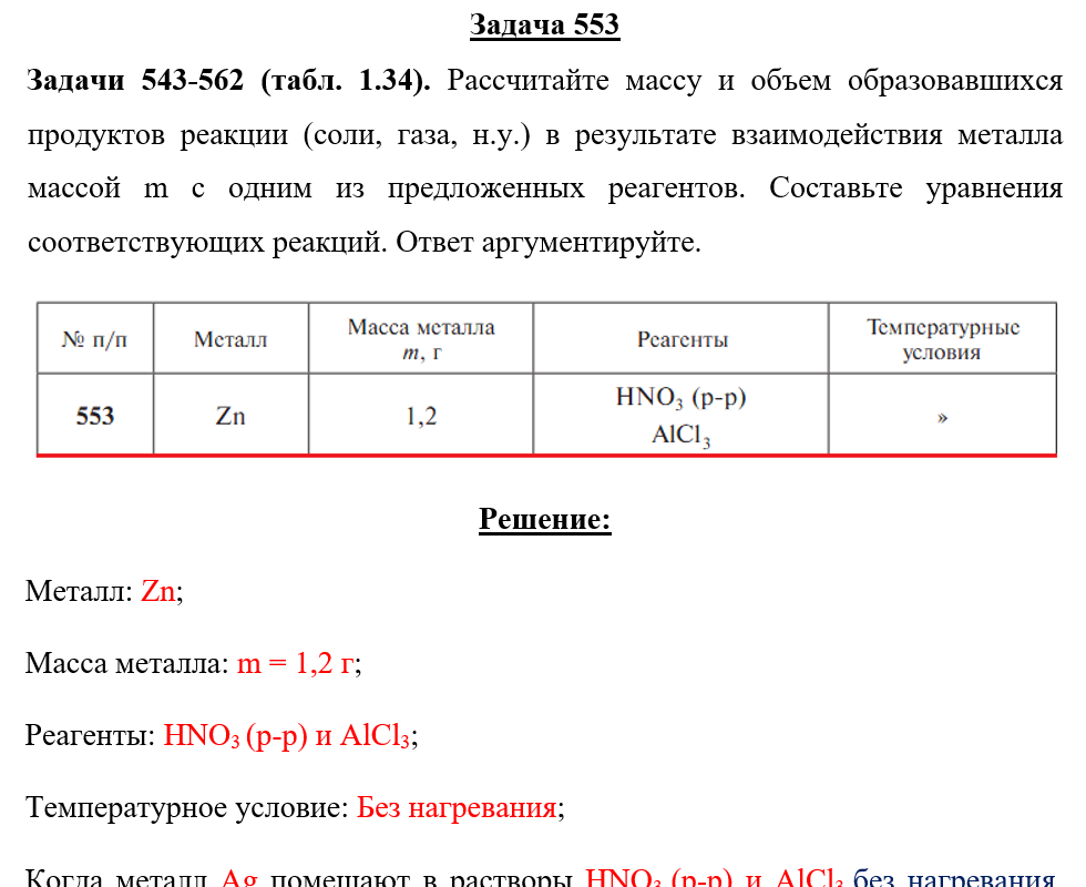 Для студентов по предмету ХимияЗадача 553 - Рассчитайте массу и объем образовавшихся продуктов реакции (соли, газа, н.у.) в результате взаимодействия металла массой m с одним из преЗадача 553 - Рассчитайте массу и объем образовавшихся продуктов реакции (соли, газа, н.у.) в результате взаимодействия металла массой m с одним из пре