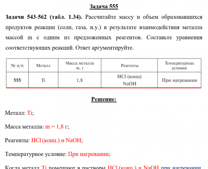 Задачи 543-562 (табл. 1.34). Рассчитайте массу и объем образовавшихся продуктов реакции (соли, газа, н.у.) в результате взаимодействия металла массой m с одним из предложенных реагентов. Составьте уравнения соответствующих реакций. Ответ аргументируйте.