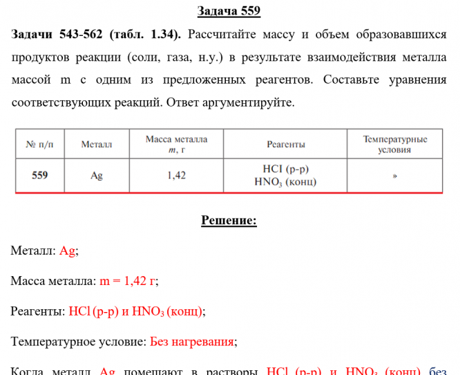 Задачи 543-562 (табл. 1.34). Рассчитайте массу и объем образовавшихся продуктов реакции (соли, газа, н.у.) в результате взаимодействия металла массой m с одним из предложенных реагентов. Составьте уравнения соответствующих реакций. Ответ аргументируйте.