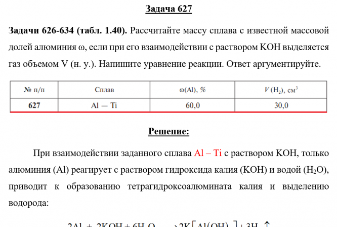 Задачи 626-634 (табл. 1.40). Рассчитайте массу сплава с известной массовой долей алюминия ω, если при его взаимодействии с раствором KOH выделяется газ объемом V (н. у.). Напишите уравнение реакции. Ответ аргументируйте..