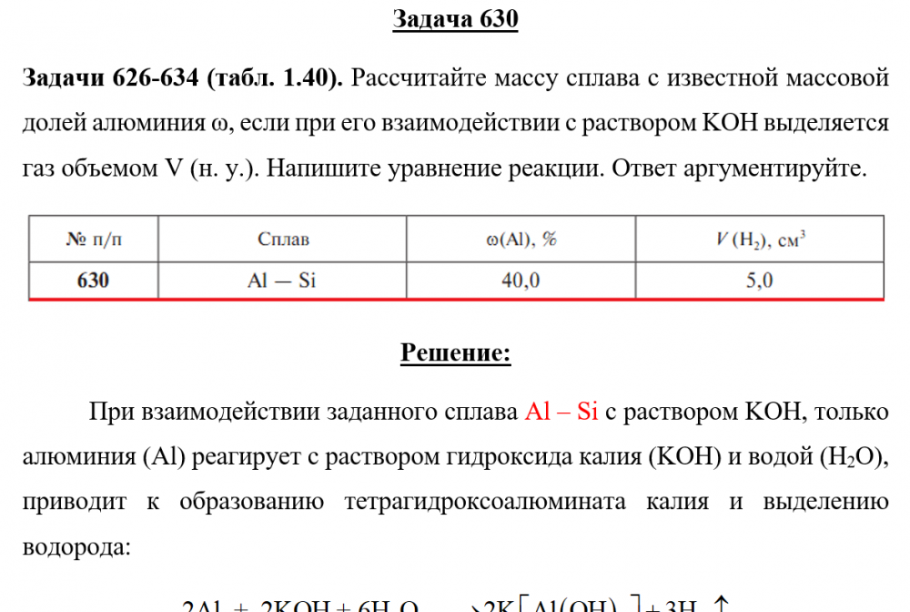 Задачи 626-634 (табл. 1.40). Рассчитайте массу сплава с известной массовой долей алюминия ω, если при его взаимодействии с раствором KOH выделяется газ объемом V (н. у.). Напишите уравнение реакции. Ответ аргументируйте.