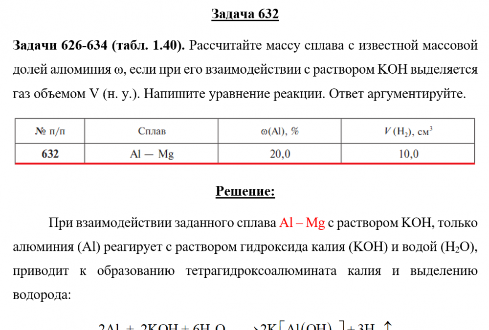 Задачи 626-634 (табл. 1.40). Рассчитайте массу сплава с известной массовой долей алюминия ω, если при его взаимодействии с раствором KOH выделяется газ объемом V (н. у.). Напишите уравнение реакции. Ответ аргументируйте.
