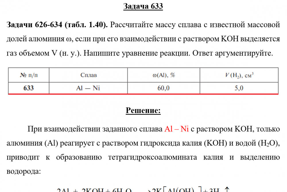 Задачи 626-634 (табл. 1.40). Рассчитайте массу сплава с известной массовой долей алюминия ω, если при его взаимодействии с раствором KOH выделяется газ объемом V (н. у.). Напишите уравнение реакции. Ответ аргументируйте..