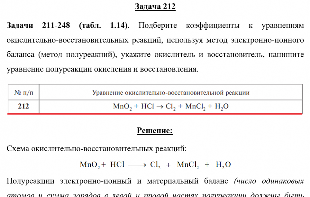 Задачи 211-248 (табл. 1.14). Подберите коэффициенты к уравнениям окислительно-восстановительных реакций, используя метод электронно-ионного баланса (метод полуреакций), укажите окислитель и восстановитель, напишите уравнение полуреакции окисления и восстановления.