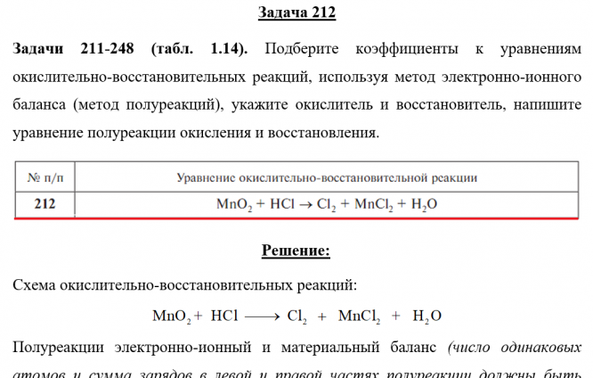 Задачи 211-248 (табл. 1.14). Подберите коэффициенты к уравнениям окислительно-восстановительных реакций, используя метод электронно-ионного баланса (метод полуреакций), укажите окислитель и восстановитель, напишите уравнение полуреакции окисления и восстановления..