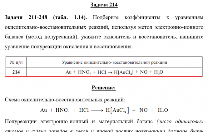 Задачи 211-248 (табл. 1.14). Подберите коэффициенты к уравнениям окислительно-восстановительных реакций, используя метод электронно-ионного баланса (метод полуреакций), укажите окислитель и восстановитель, напишите уравнение полуреакции окисления и восстановления.