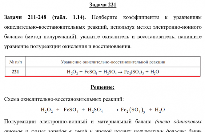 Задачи 211-248 (табл. 1.14). Подберите коэффициенты к уравнениям окислительно-восстановительных реакций, используя метод электронно-ионного баланса (метод полуреакций), укажите окислитель и восстановитель, напишите уравнение полуреакции окисления и восстановления..