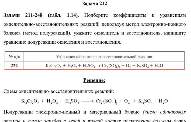 Задачи 211-248 (табл. 1.14). Подберите коэффициенты к уравнениям окислительно-восстановительных реакций, используя метод электронно-ионного баланса (метод полуреакций), укажите окислитель и восстановитель, напишите уравнение полуреакции окисления и восстановления.