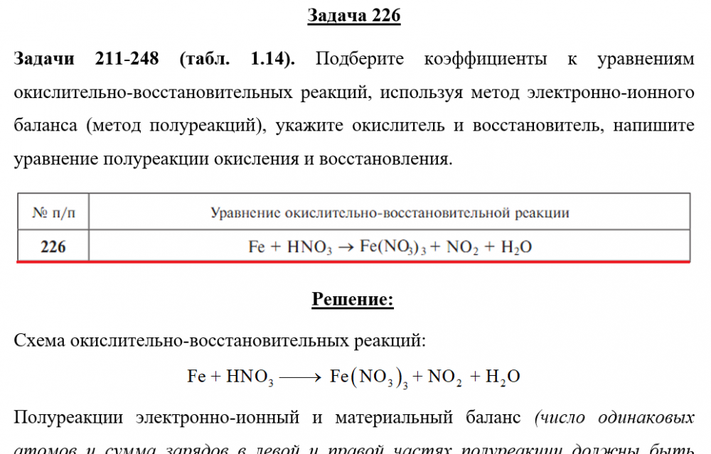 Задачи 211-248 (табл. 1.14). Подберите коэффициенты к уравнениям окислительно-восстановительных реакций, используя метод электронно-ионного баланса (метод полуреакций), укажите окислитель и восстановитель, напишите уравнение полуреакции окисления и восстановления.