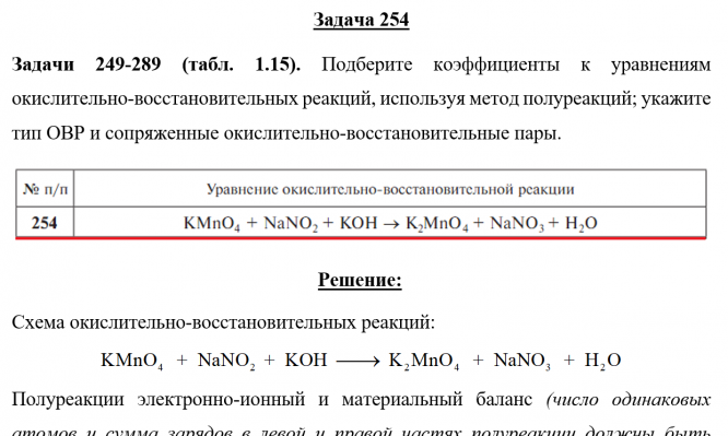 Задачи 249-289 (табл. 1.15). Подберите коэффициенты к уравнениям окислительно-восстановительных реакций, используя метод полуреакций; укажите тип ОВР и сопряженные окислительно-восстановительные пары..
