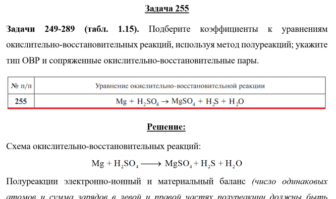 Задача 255 - Подберите коэффициенты к уравнениям окислительно-восстановительных реакций, используя метод полуреакций; укажите тип ОВР и сопряженные окислительно-восстановительные пары.