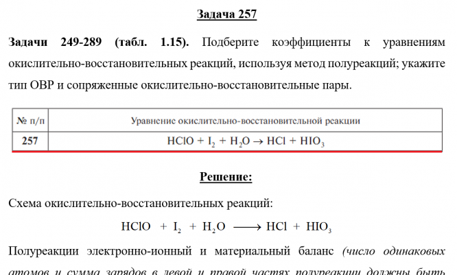 Задачи 249-289 (табл. 1.15). Подберите коэффициенты к уравнениям окислительно-восстановительных реакций, используя метод полуреакций; укажите тип ОВР и сопряженные окислительно-восстановительные пары.