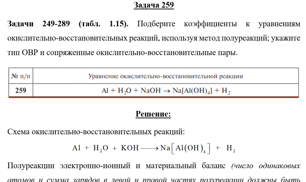 Задачи 249-289 (табл. 1.15). Подберите коэффициенты к уравнениям окислительно-восстановительных реакций, используя метод полуреакций; укажите тип ОВР и сопряженные окислительно-восстановительные пары.