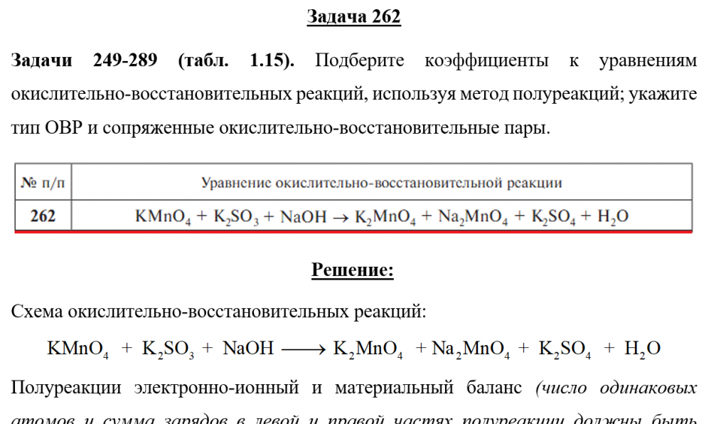 Задача 262 - Подберите коэффициенты к уравнениям окислительно-восстановительных реакций, используя метод полуреакций; укажите тип ОВР и сопряженные окислительно-восстановительные пары.