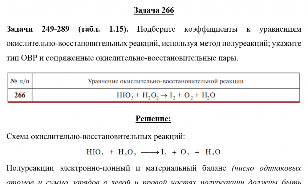 Задача 266 - Подберите коэффициенты к уравнениям окислительно-восстановительных реакций, используя метод полуреакций; укажите тип ОВР и сопряженные окислительно-восстановительные пары.