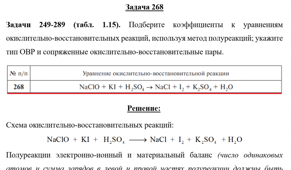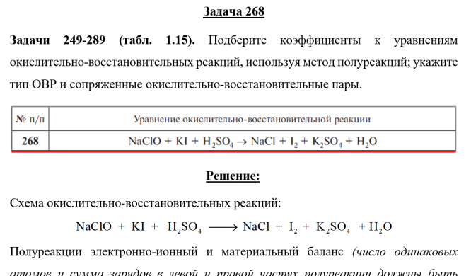 Задача 268 - Подберите коэффициенты к уравнениям окислительно-восстановительных реакций, используя метод полуреакций; укажите тип ОВР и сопряженные окислительно-восстановительные пары.