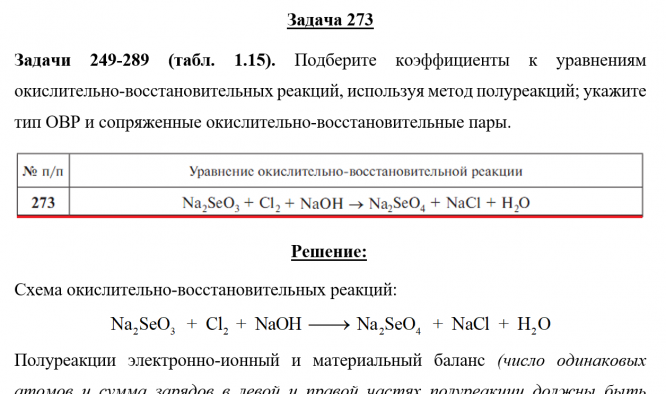 Задача 273 - Подберите коэффициенты к уравнениям окислительно-восстановительных реакций, используя метод полуреакций; укажите тип ОВР и сопряженные окислительно-восстановительные пары.