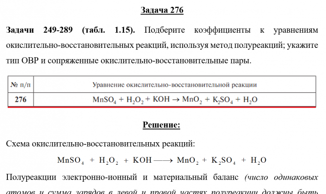 Задача 276 - Подберите коэффициенты к уравнениям окислительно-восстановительных реакций, используя метод полуреакций; укажите тип ОВР и сопряженные окислительно-восстановительные пары.