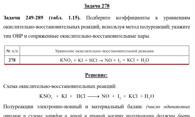 Задача 278 - Подберите коэффициенты к уравнениям окислительно-восстановительных реакций, используя метод полуреакций; укажите тип ОВР и сопряженные окислительно-восстановительные пары.