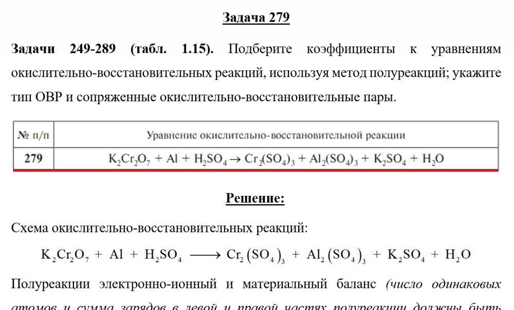 Задача 279 - Подберите коэффициенты к уравнениям окислительно-восстановительных реакций, используя метод полуреакций; укажите тип ОВР и сопряженные окислительно-восстановительные пары.