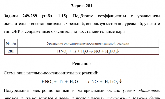 Задачи 249-289 (табл. 1.15). Подберите коэффициенты к уравнениям окислительно-восстановительных реакций, используя метод полуреакций; укажите тип ОВР и сопряженные окислительно-восстановительные пары.