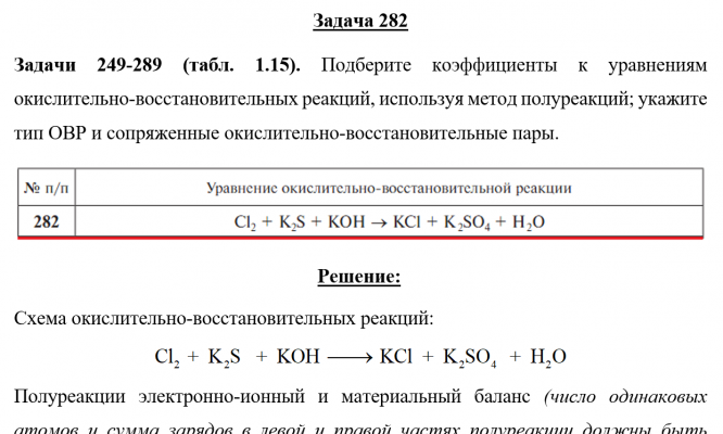Задачи 249-289 (табл. 1.15). Подберите коэффициенты к уравнениям окислительно-восстановительных реакций, используя метод полуреакций; укажите тип ОВР и сопряженные окислительно-восстановительные пары..