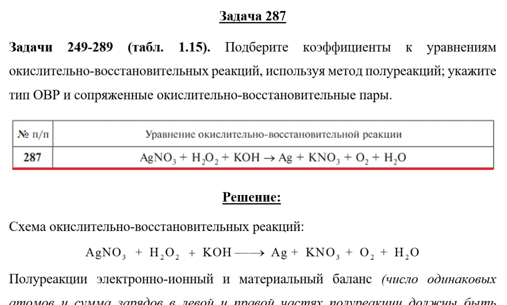 Задача 287 - Подберите коэффициенты к уравнениям окислительно-восстановительных реакций, используя метод полуреакций; укажите тип ОВР и сопряженные окислительно-восстановительные пары.