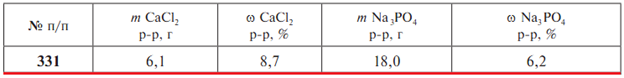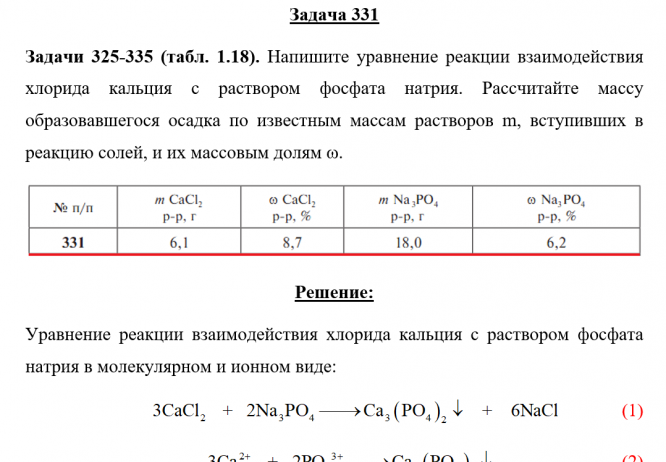 Задачи 325-335 (табл. 1.18). Напишите уравнение реакции взаимодействия хлорида кальция с раствором фосфата натрия. Рассчитайте массу образовавшегося осадка по известным массам растворов m, вступивших в реакцию солей, и их массовым долям ω..