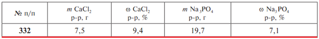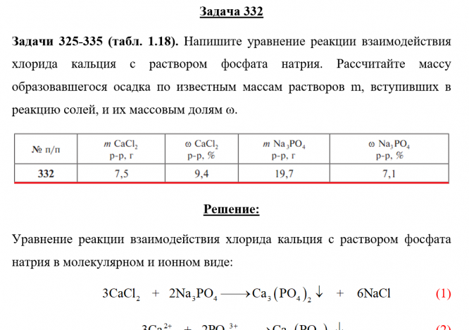 Задачи 325-335 (табл. 1.18). Напишите уравнение реакции взаимодействия хлорида кальция с раствором фосфата натрия. Рассчитайте массу образовавшегося осадка по известным массам растворов m, вступивших в реакцию солей, и их массовым долям ω..