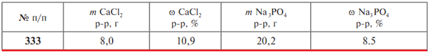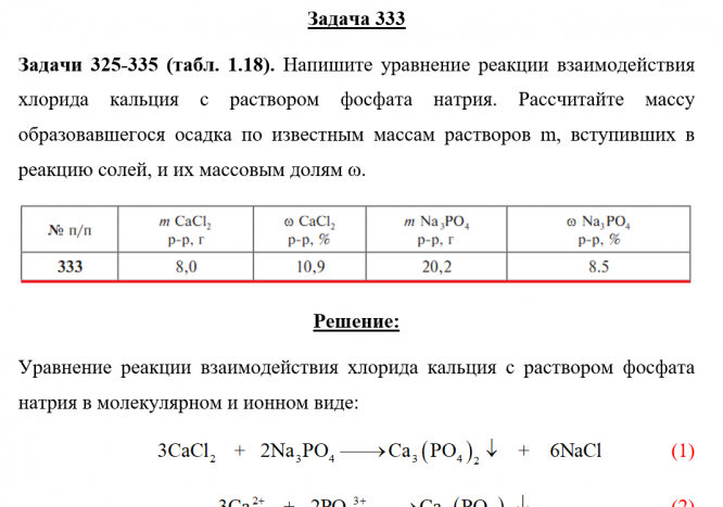 Задачи 325-335 (табл. 1.18). Напишите уравнение реакции взаимодействия хлорида кальция с раствором фосфата натрия. Рассчитайте массу образовавшегося осадка по известным массам растворов m, вступивших в реакцию солей, и их массовым долям ω..