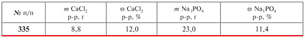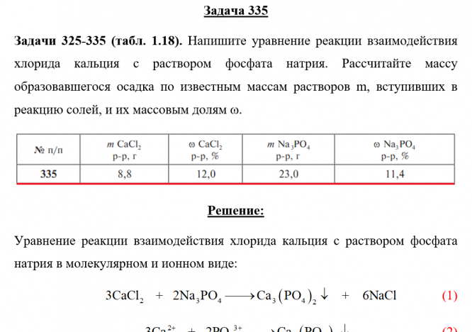 Задачи 325-335 (табл. 1.18). Напишите уравнение реакции взаимодействия хлорида кальция с раствором фосфата натрия. Рассчитайте массу образовавшегося осадка по известным массам растворов m, вступивших в реакцию солей, и их массовым долям ω..