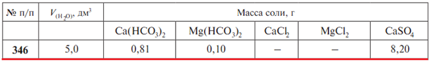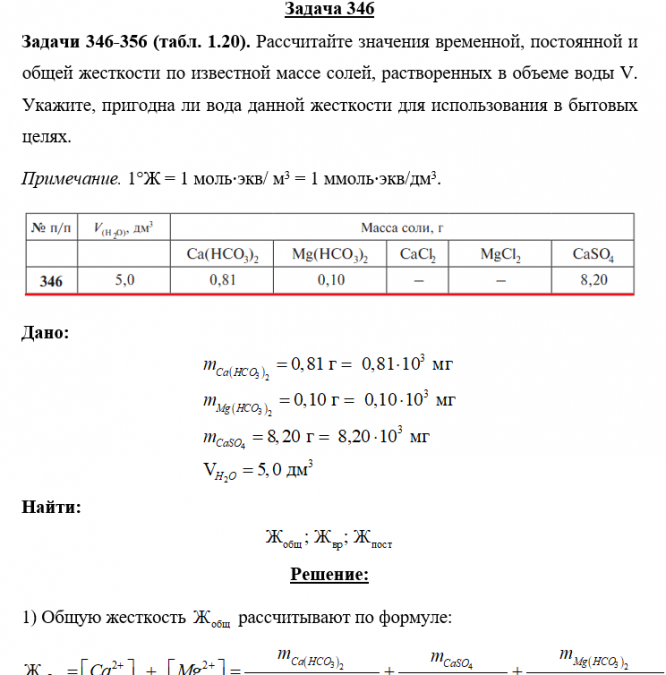 Задачи 346-356 (табл. 1.20). Рассчитайте значения временной, постоянной и общей жесткости по известной массе солей, растворенных в объеме воды V. Укажите, пригодна ли вода данной жесткости для использования в бытовых целях. Примечание. 1°Ж = 1 ммоль⋅экв/ дм3 = 1 ммоль⋅экв/дм3..