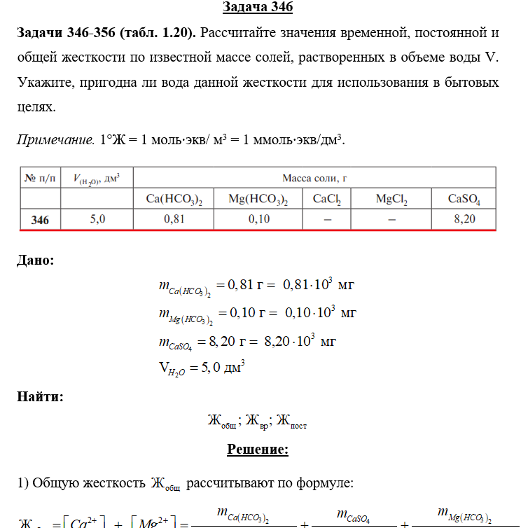 Задачи 346-356 (табл. 1.20). Рассчитайте значения временной, постоянной и общей жесткости по известной массе солей, растворенных в объеме воды V. Укажите, пригодна ли вода данной жесткости для использования в бытовых целях. Примечание. 1°Ж = 1 ммоль⋅экв/ дм3 = 1 ммоль⋅экв/дм3.