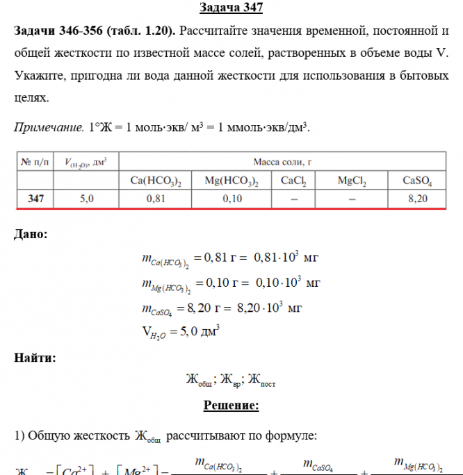 Задачи 346-356 (табл. 1.20). Рассчитайте значения временной, постоянной и общей жесткости по известной массе солей, растворенных в объеме воды V. Укажите, пригодна ли вода данной жесткости для использования в бытовых целях. Примечание. 1°Ж = 1 ммоль⋅экв/ дм3 = 1 ммоль⋅экв/дм3..