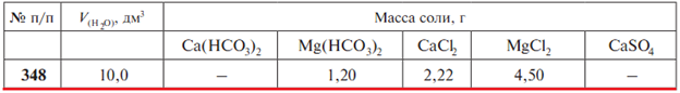 Задачи 346-356 (табл. 1.20). Рассчитайте значения временной, постоянной и общей жесткости по известной массе солей, растворенных в объеме воды V. Укажите, пригодна ли вода данной жесткости для использования в бытовых целях. Примечание. 1°Ж = 1 ммоль⋅экв/ дм3 = 1 ммоль⋅экв/дм3.