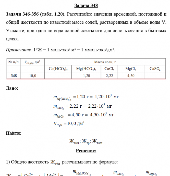 Задачи 346-356 (табл. 1.20). Рассчитайте значения временной, постоянной и общей жесткости по известной массе солей, растворенных в объеме воды V. Укажите, пригодна ли вода данной жесткости для использования в бытовых целях. Примечание. 1°Ж = 1 ммоль⋅экв/ дм3 = 1 ммоль⋅экв/дм3..
