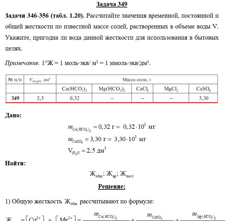 Задачи 346-356 (табл. 1.20). Рассчитайте значения временной, постоянной и общей жесткости по известной массе солей, растворенных в объеме воды V. Укажите, пригодна ли вода данной жесткости для использования в бытовых целях. Примечание. 1°Ж = 1 ммоль⋅экв/ дм3 = 1 ммоль⋅экв/дм3..