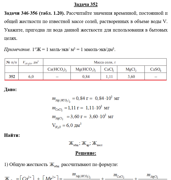 Задача 352 - Рассчитайте значения временной, постоянной и общей жесткости по известной массе солей, растворенных в объеме воды V. Укажите, пригодна ли вода данной жесткости для использования в бытовых целях. Примечание. 1°Ж = 1 ммоль⋅экв/ дм3 = 1 ммо