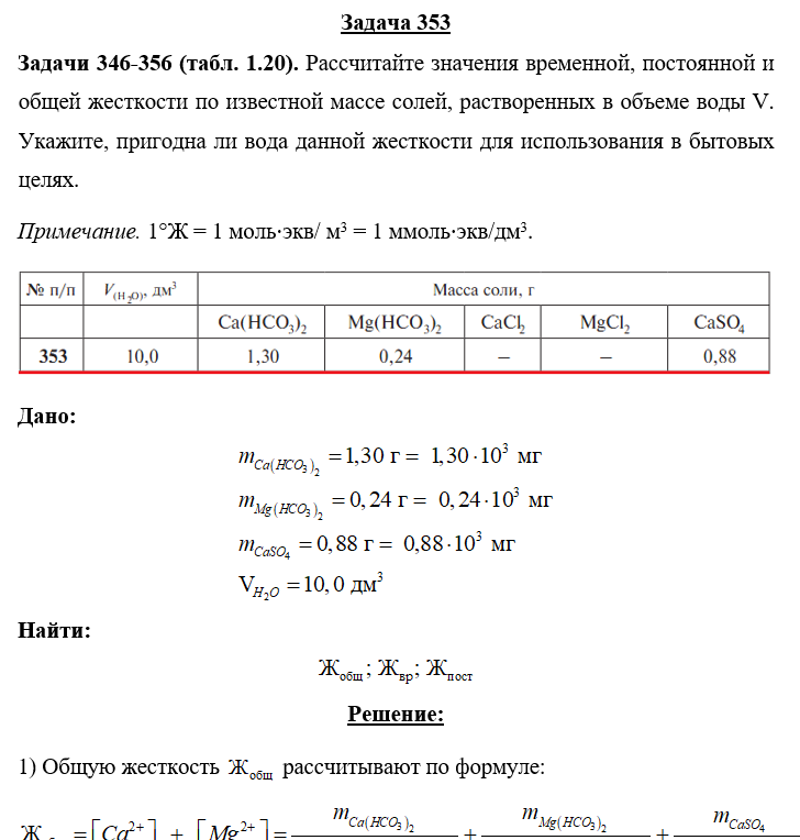Задачи 346-356 (табл. 1.20). Рассчитайте значения временной, постоянной и общей жесткости по известной массе солей, растворенных в объеме воды V. Укажите, пригодна ли вода данной жесткости для использования в бытовых целях. Примечание. 1°Ж = 1 ммоль⋅экв/ дм3 = 1 ммоль⋅экв/дм3..