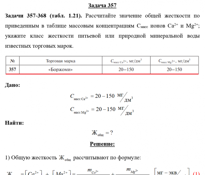 Главная » Учебные материалы » Химия » Решения задач » Несколько классов/семестров » Номер 357 » Задача 357 - Рассчитайте значение общей жесткости по приведенным в таблице массовым концентрациям Смасс ионов Ca2+ и Mg2+; укажите класс жесткости питьевой или природной минеральной воды известных торговых марок.