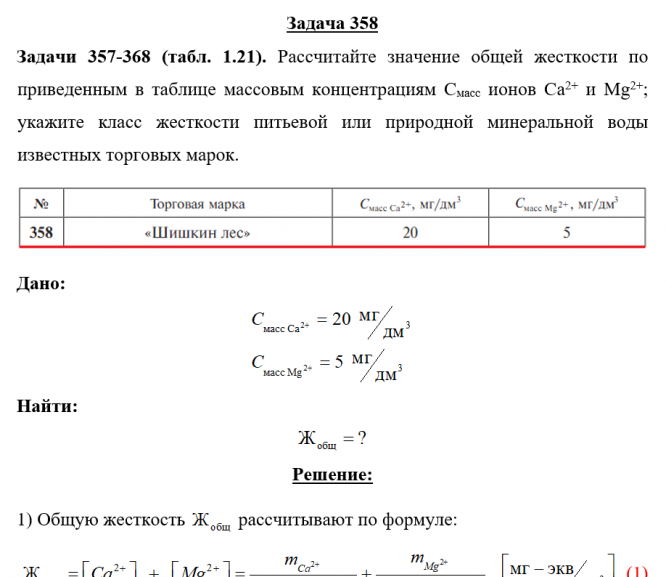 Задача 358 - Рассчитайте значение общей жесткости по приведенным в таблице массовым концентрациям Смасс ионов Ca2+ и Mg2+; укажите класс жесткости питьевой или природной минеральной воды известных торговых марок.