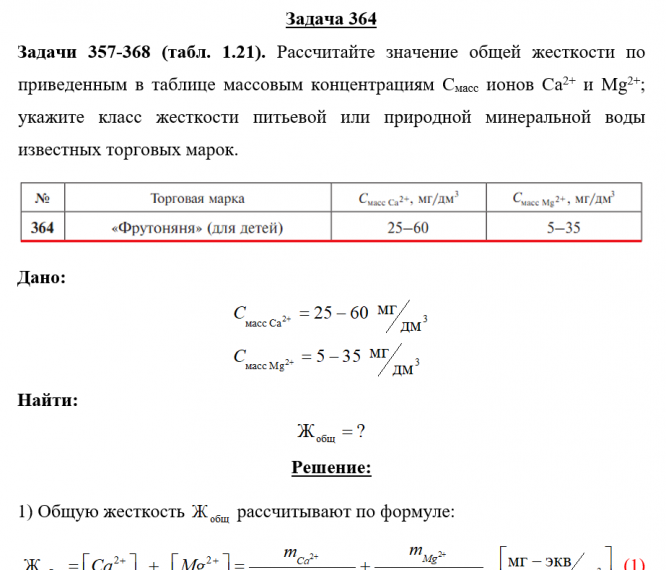 Для студентов по предмету ХимияЗадача 364 - Рассчитайте значение общей жесткости по приведенным в таблице массовым концентрациям Смасс ионов Ca2+ и Mg2+; укажите класс жесткости питЗадача 364 - Рассчитайте значение общей жесткости по приведенным в таблице массовым концентрациям Смасс ионов Ca2+ и Mg2+; укажите класс жесткости пит
