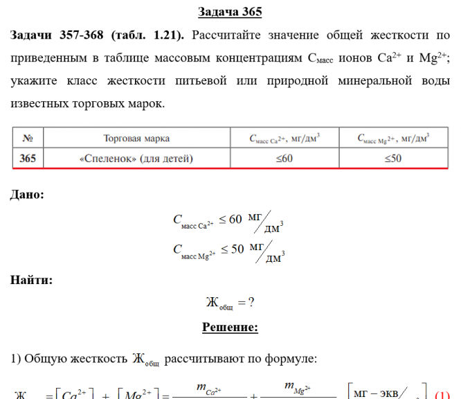 Главная » Учебные материалы » Химия » Решения задач » Несколько классов/семестров » Номер 365 » Задача 365 - Рассчитайте значение общей жесткости по приведенным в таблице массовым концентрациям Смасс ионов Ca2+ и Mg2+; укажите класс жесткости питьевой или природной минеральной воды известных торговых марок.