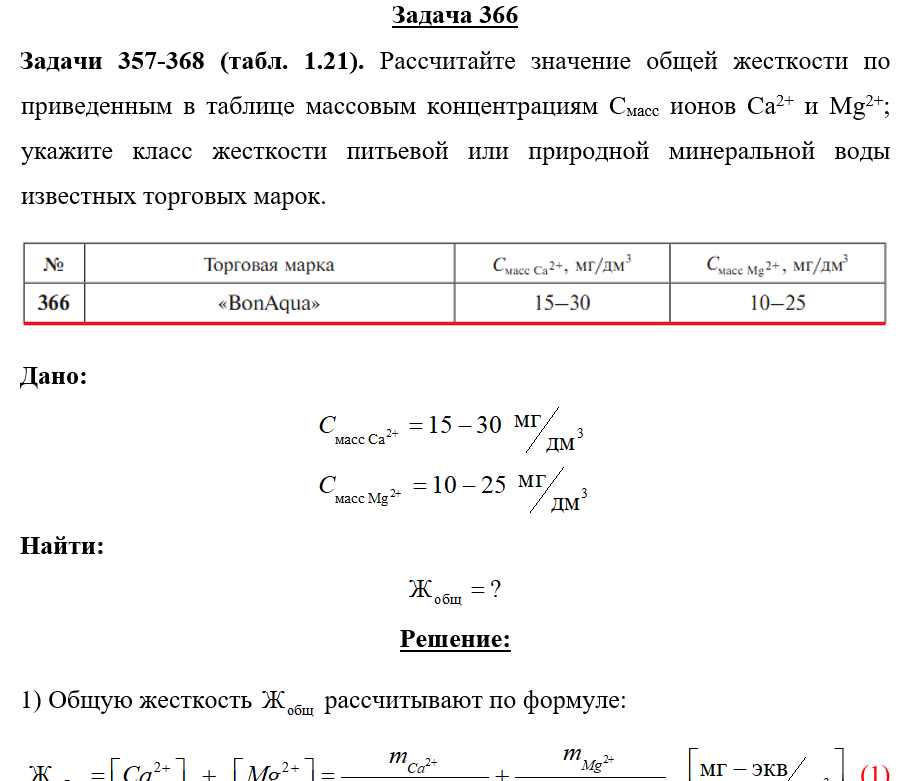 Для студентов по предмету ХимияЗадача 366 - Рассчитайте значение общей жесткости по приведенным в таблице массовым концентрациям Смасс ионов Ca2+ и Mg2+; укажите класс жесткости питЗадача 366 - Рассчитайте значение общей жесткости по приведенным в таблице массовым концентрациям Смасс ионов Ca2+ и Mg2+; укажите класс жесткости пит