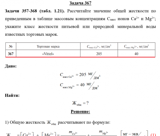 Для студентов по предмету ХимияЗадача 367 - Рассчитайте значение общей жесткости по приведенным в таблице массовым концентрациям Смасс ионов Ca2+ и Mg2+; укажите класс жесткости питЗадача 367 - Рассчитайте значение общей жесткости по приведенным в таблице массовым концентрациям Смасс ионов Ca2+ и Mg2+; укажите класс жесткости пит